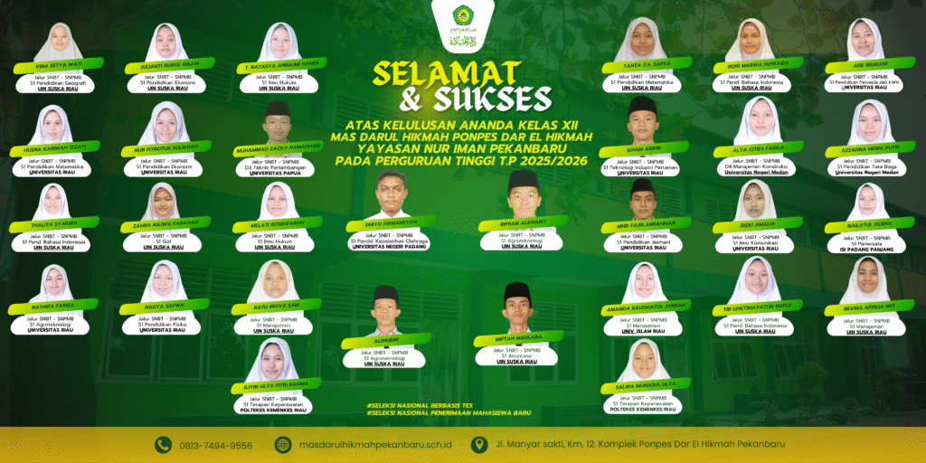 Alhamdulillah atas nama keluarga besar Madrasah Aliyah Swasta Darul Hikmah | Pondok Pesantren Dar El Hikmah | Yayasan Nur Iman Pekanbaru, kami mengucapkan selamat dan sukses kepada para peserta didik yang telah berhasil lolos dan diterima di perguruan tinggi negeri favorit melalui jalur SNBT SNPMB tahun 2025.